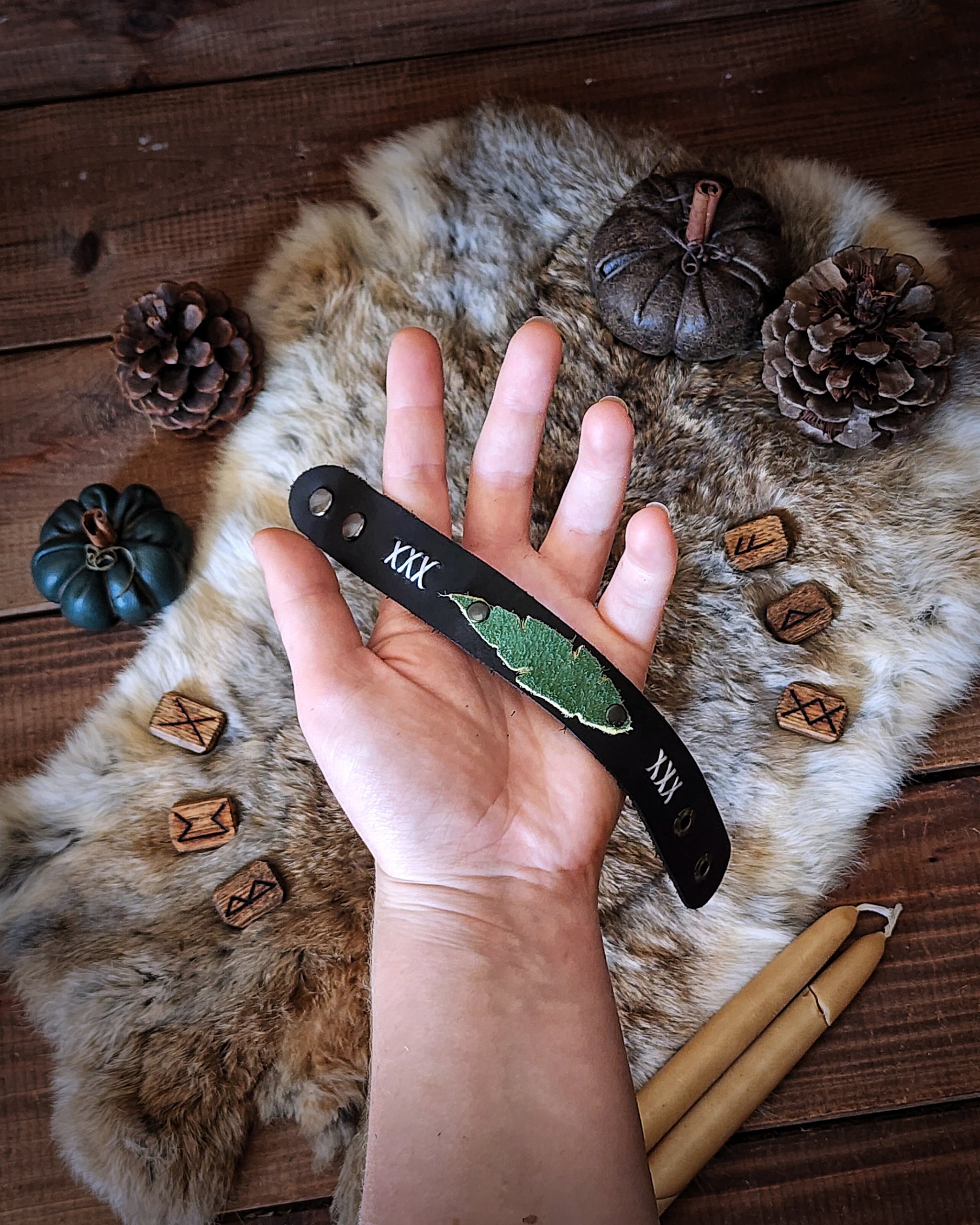 You can choose one rune to personalize your piece, on the leather leaf or feather.