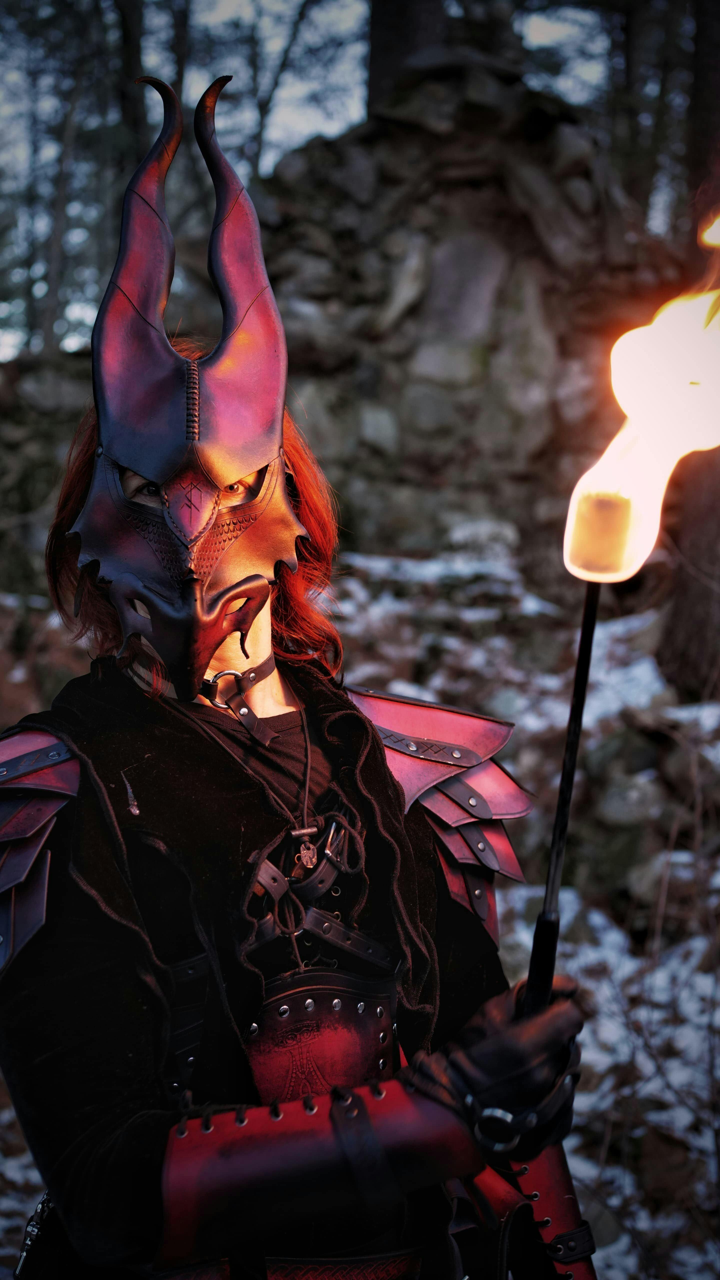 I get stopped constantly at Renn faires from people asking me where I got my mask. It's also a perfect headdress. The mask is the soul of the set. It tells the story of power that makes our myth manifest.