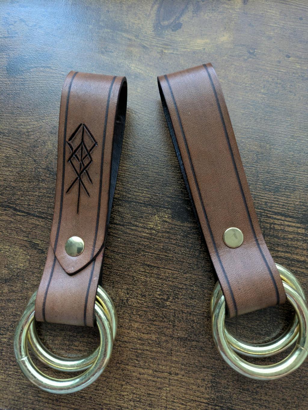 This pair of rune-carved leather skirt hikes is perfectly useful for gathering your many layers of flowing skirts. Featuring welded metal rings, these pieces are great for LARP, SCA, Halloween, Renaissance Faires, festivals, or even everyday wear. Your skirt hikes will be personalized with your choice of Rune or Bindrune on the front (see details below) and dyed with your choice of colors.