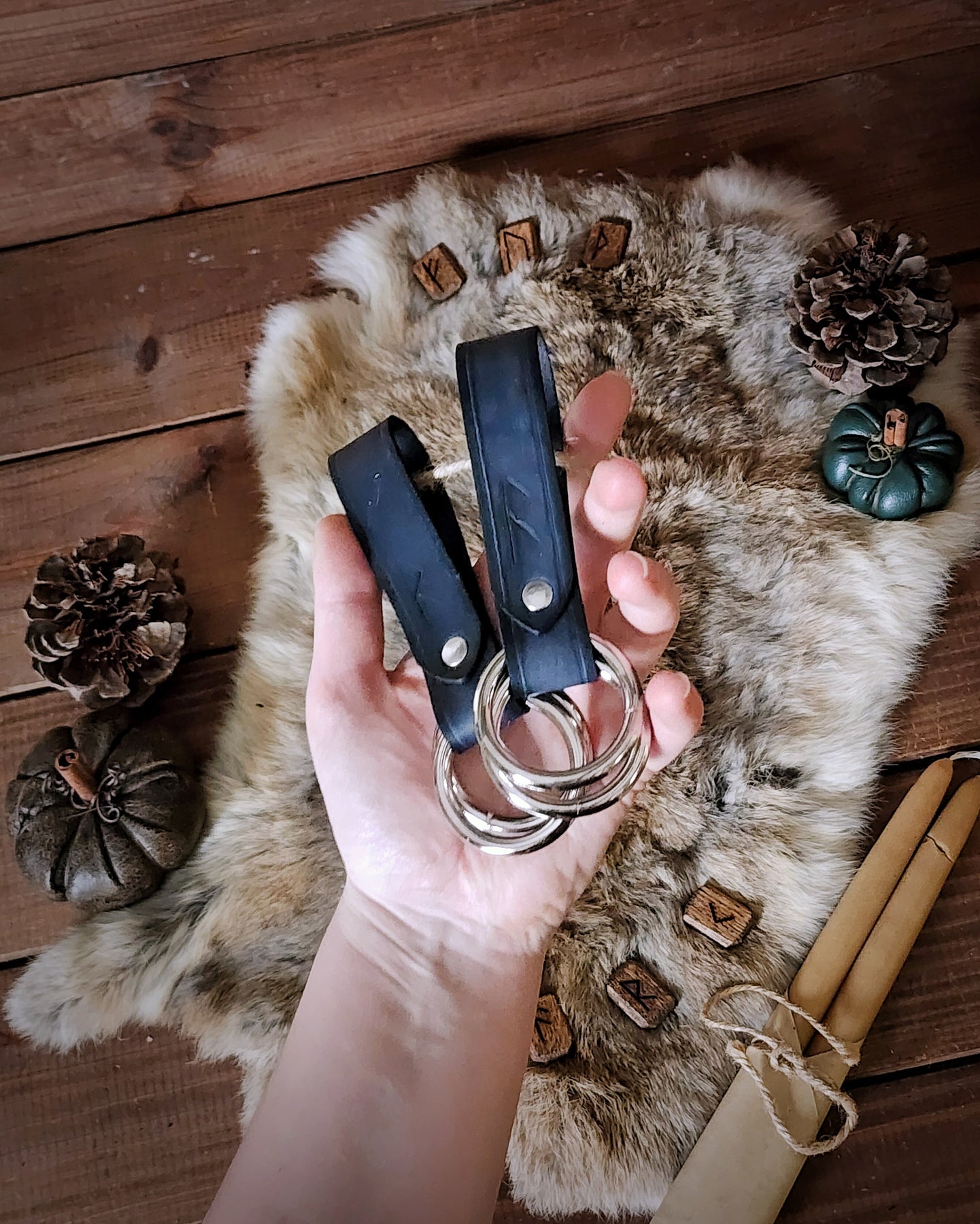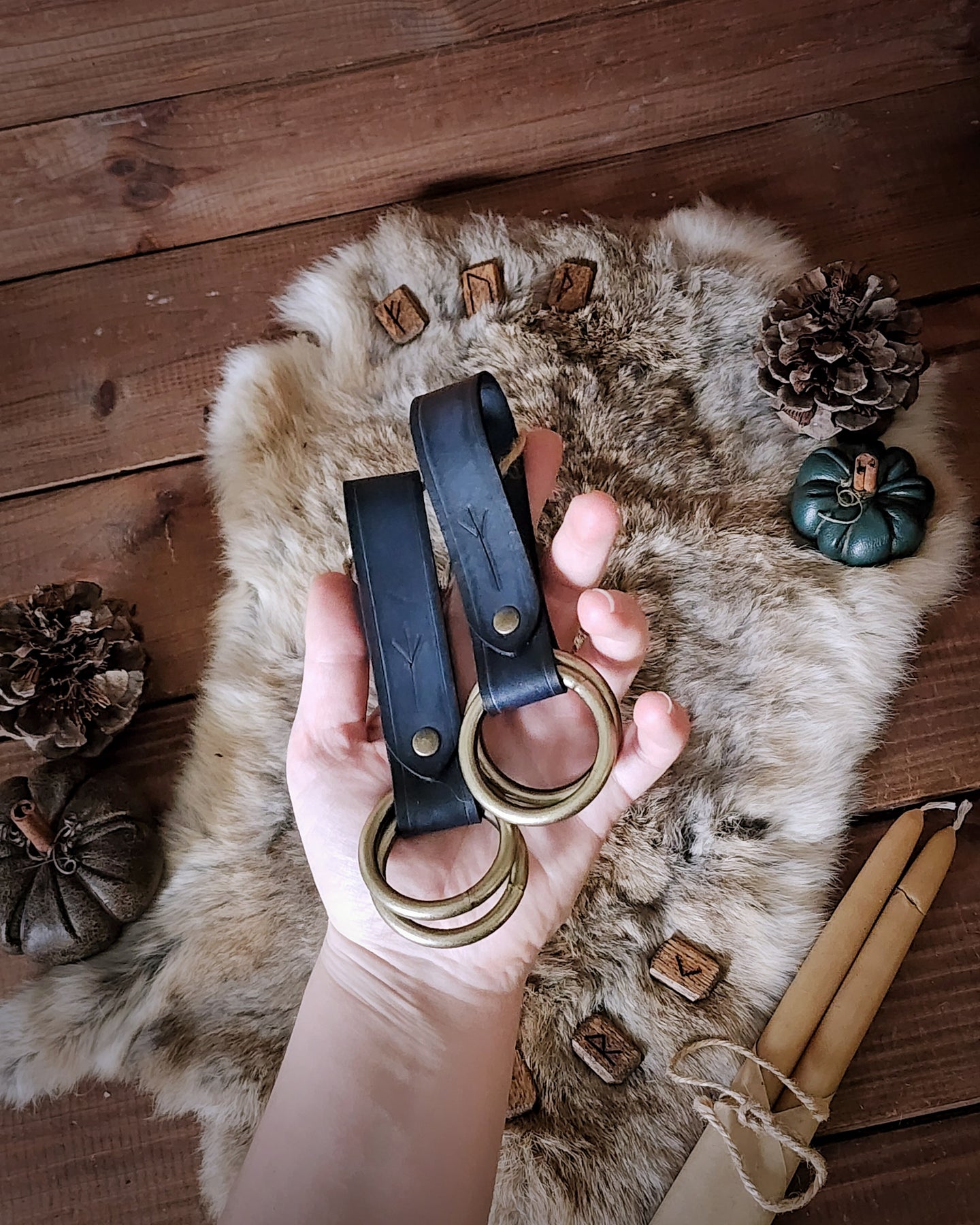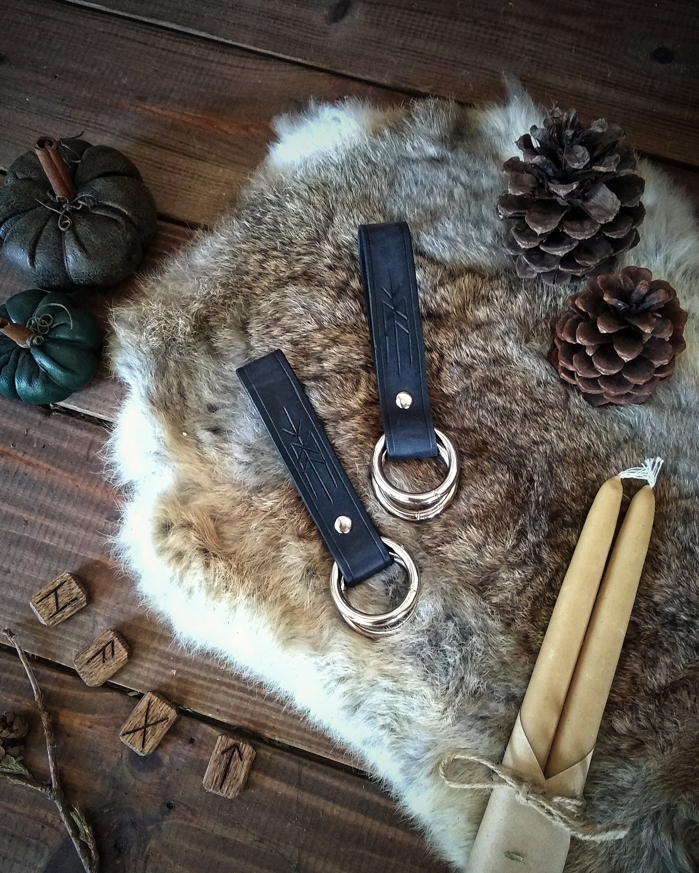 This pair of rune-carved leather skirt hikes is perfectly useful for gathering your many layers of flowing skirts. Featuring welded metal rings, these pieces are great for LARP, SCA, Halloween, Renaissance Faires, festivals, or even everyday wear. The default ring size is 1.5", unless otherwise selected by ordering the Custom variant.
