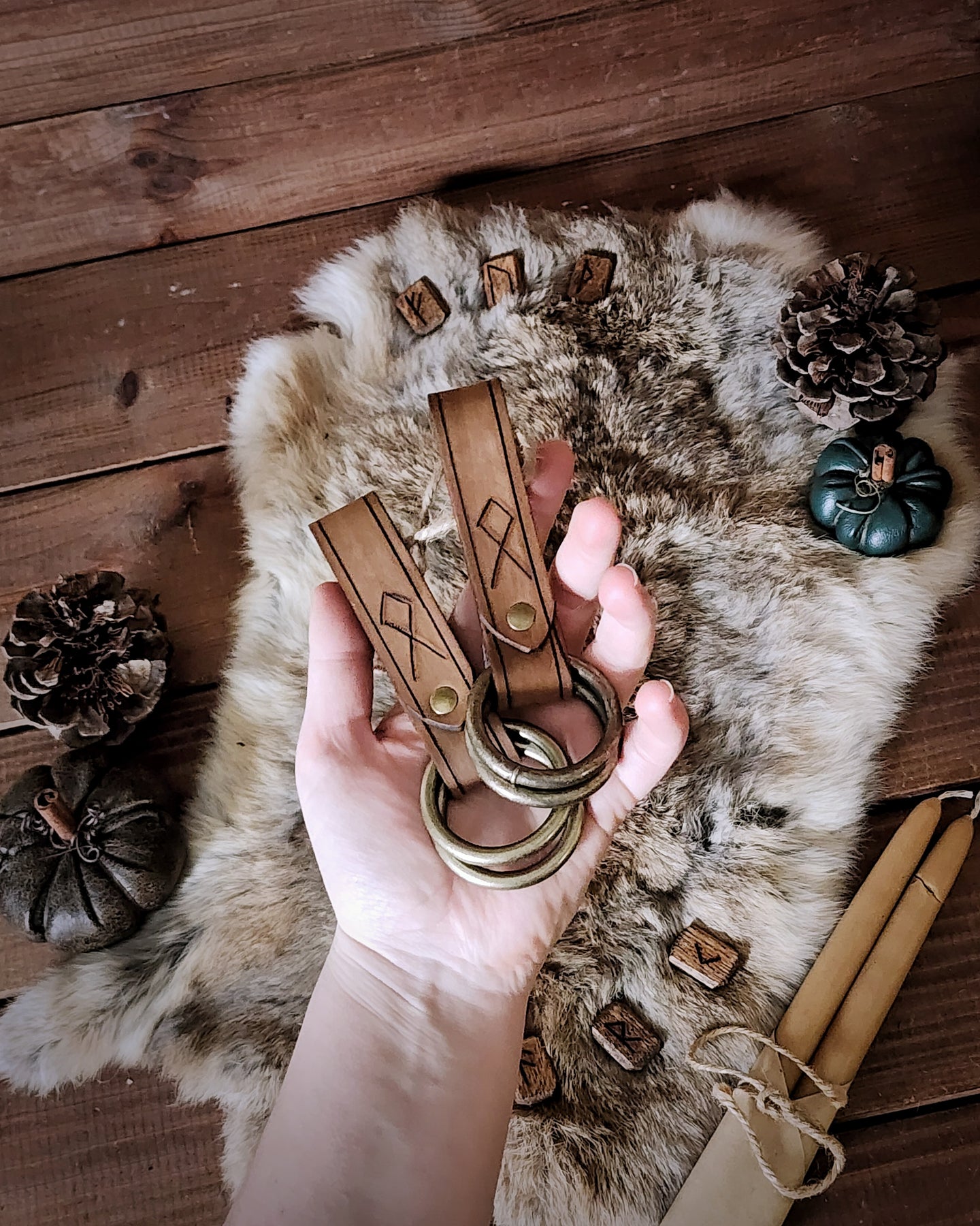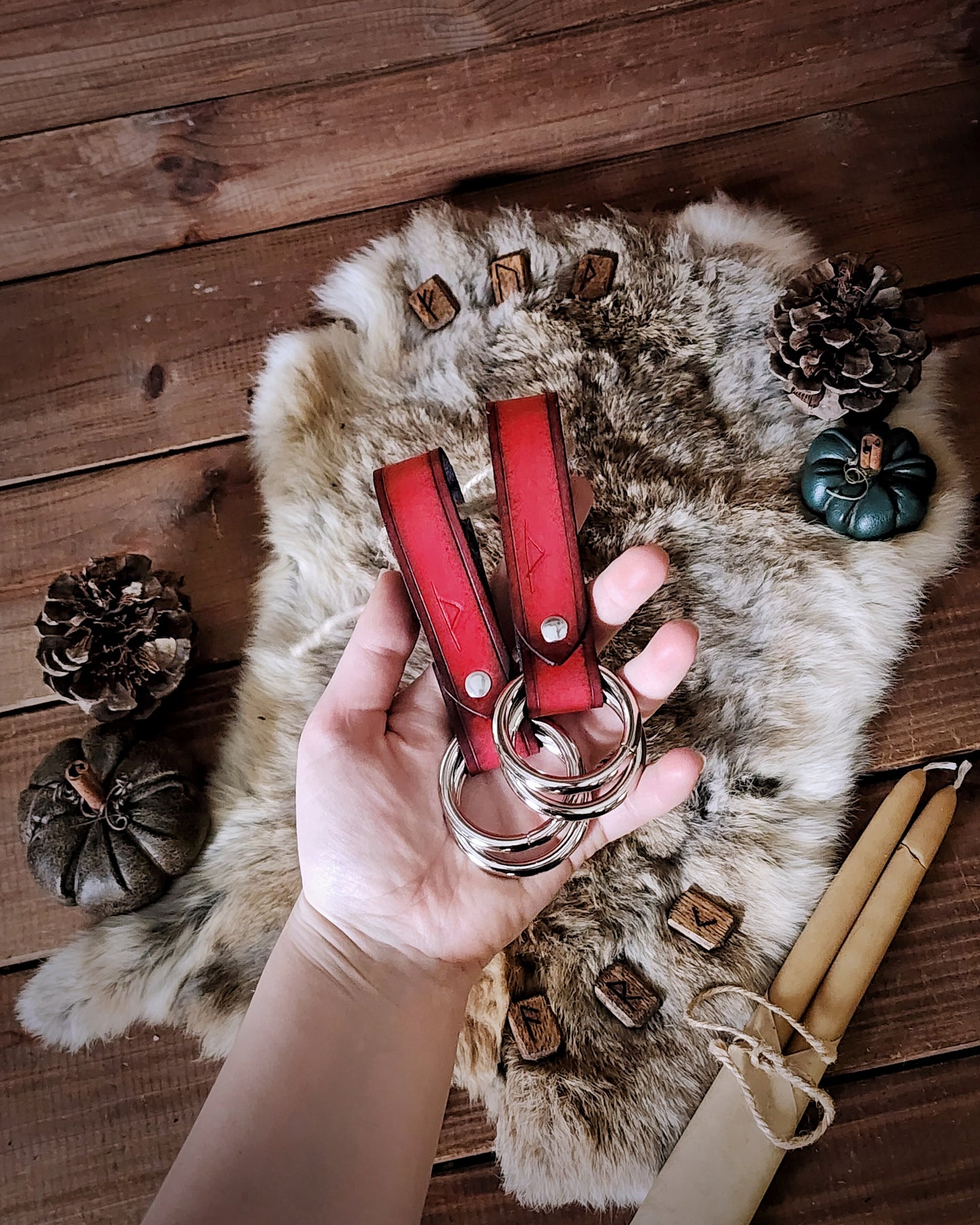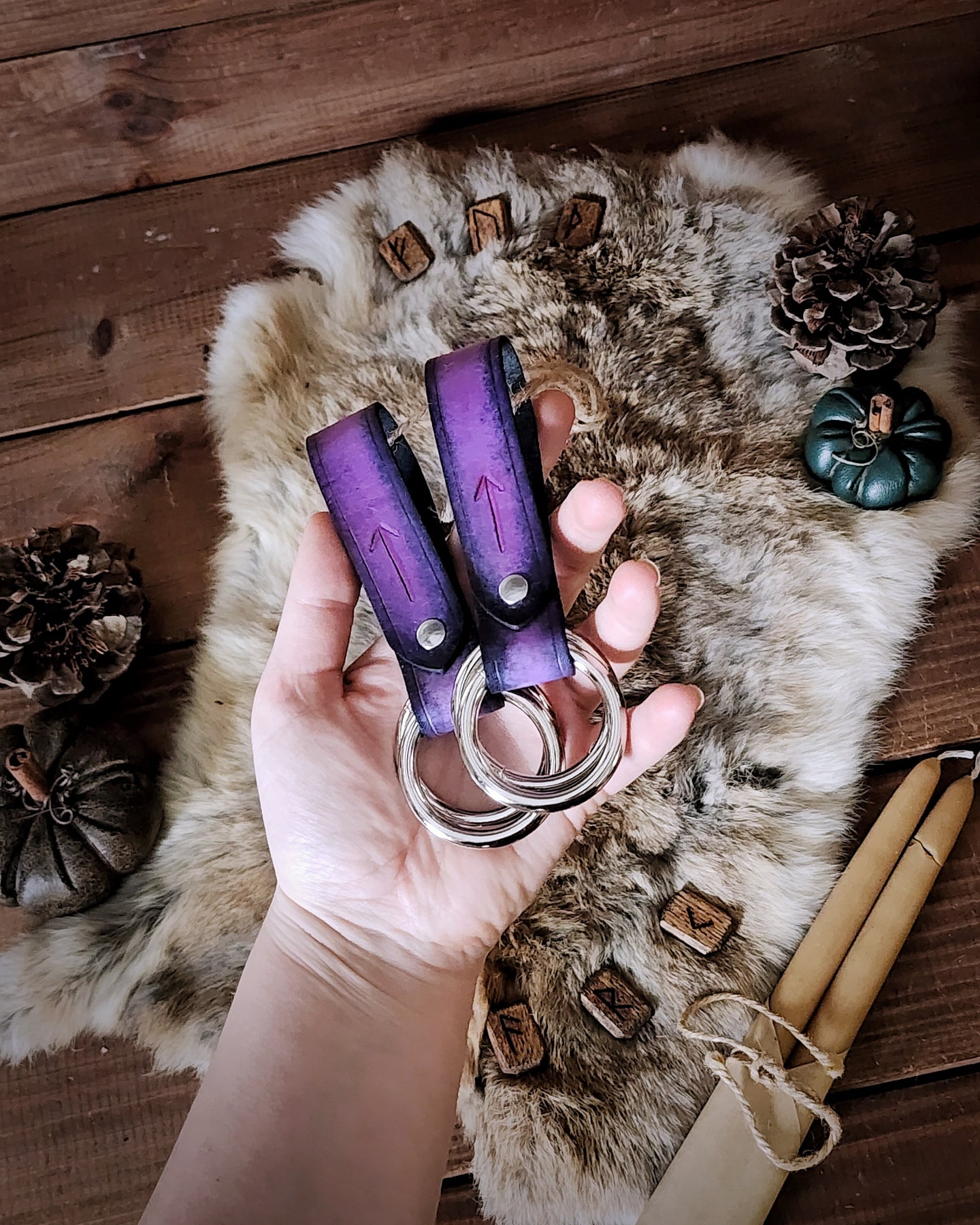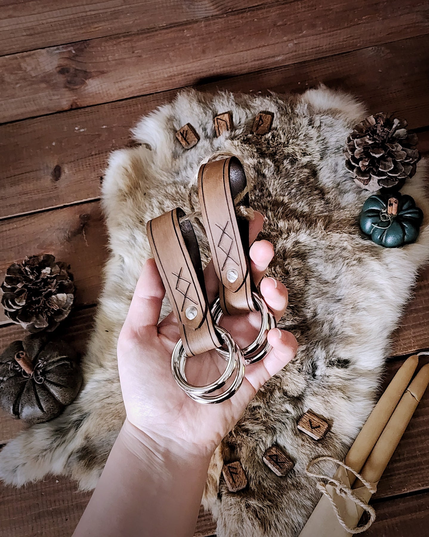 This pair of rune-carved leather skirt hikes is perfectly useful for gathering your many layers of flowing skirts. Featuring welded metal rings, these pieces are great for LARP, SCA, Halloween, Renaissance Faires, festivals, or even everyday wear. The default ring size is 1.5", unless otherwise selected by ordering the Custom variant.