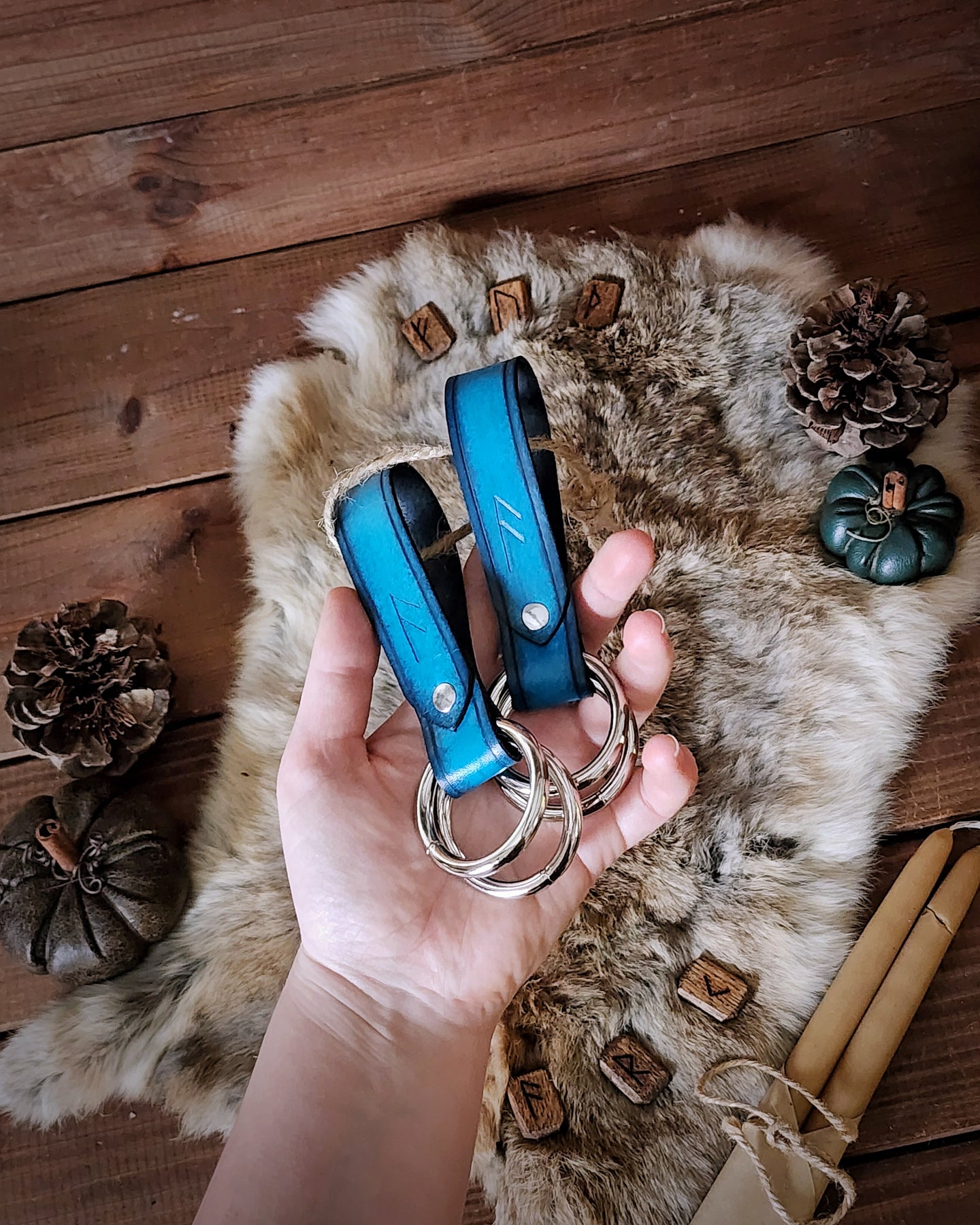 Odin Blue: Dyed blue with a black edge fade, with silver hardware. Engraved with Ansuz (Wisdom).