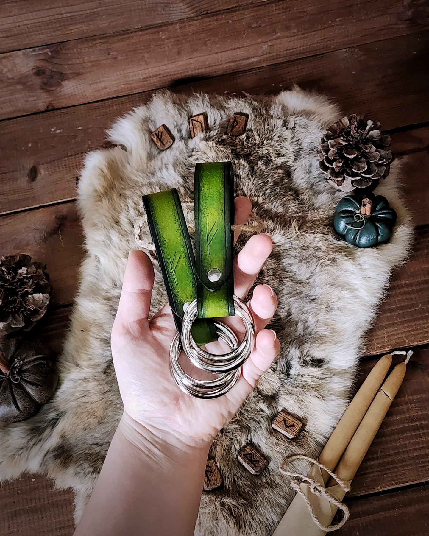 Freyja Green: Dyed green with a black edge fade, with silver hardware. Engraved with Fehu (Wealth).